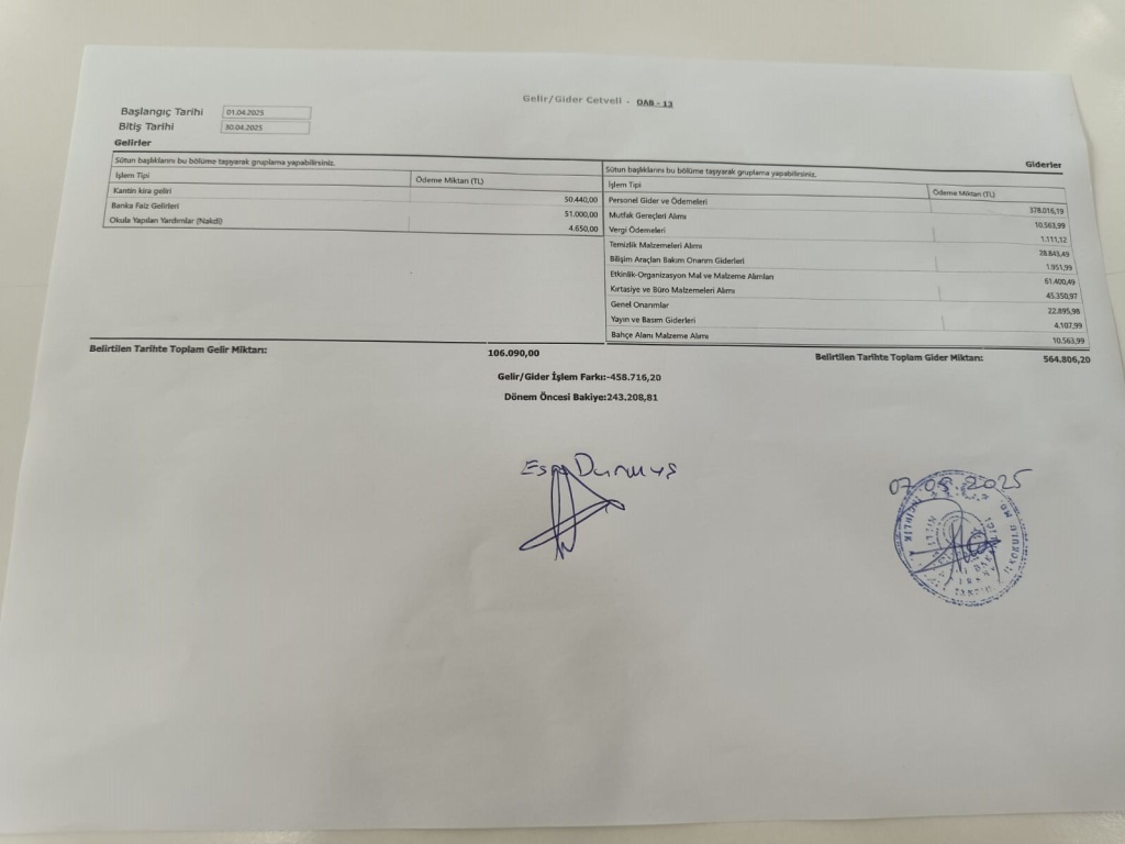 Okul Aile Birliği 2025 Nisan Ayı Gelir-Gider Tablosu